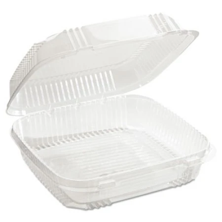 ClearView SmartLock Containers, 49oz, 8 13/64 x 8 11/32 x 2 29/32, 200/Carton. SmartLock® system features a tight, audible click closure that helps ensure maximum food freshness. Wide temperature resilience range (20°F to 180°F) enables placement in freezers and heated display cases. Smooth front panel makes sticker-labeling easy. Strong, rib-reinforced sides and back accommodate heavy items and provide enhanced crush resistance. Break-resistant hinge is flexible enough for easy closure and reliable enough for repeated openings and closings. Food Container Type: Carryout; Material(s): Plastic; Capacity (Volume): 49 oz; Color(s): Clear.