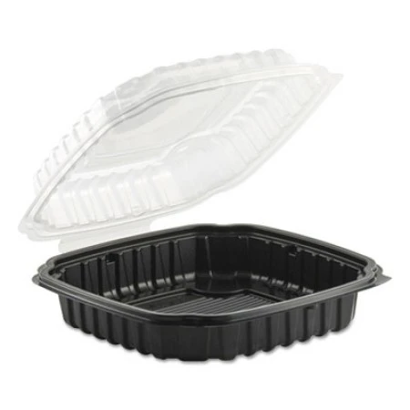 Culinary Basics Microwavable Container, 46.5 oz, 10.5 x 9.5 x 2.5, Clear/Black, 100/Carton. Culinary Basics can withstand temperatures up to 230°F when used under heat lamps, in warming units and microwaves. The clear lid is designed using anti-fog technology. Food Container Type: Container/Lid Combo; Material(s): Polypropylene; Capacity (Volume): 46.5 oz; Color(s): Clear/Black.