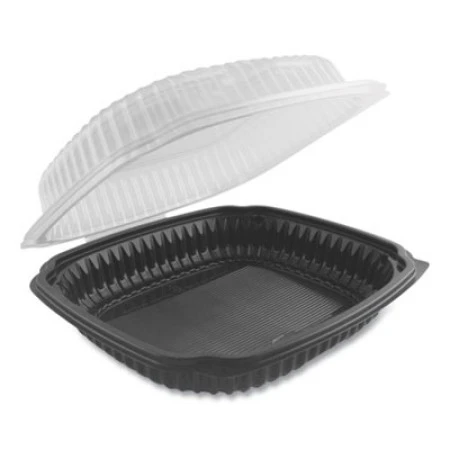 Culinary Lites Microwavable Container, 39 oz, 9 x 9 x 3.01, Clear/Black, 100/Carton. Culinary Lites hinged containers offer increased value and affordable alternatives to foam and paper clamshells. Will withstand temperatures to 210°F under heat lamps, in warming units and microwaves. The clear, anti-fog lid is vented to allow steam to dissipate, keeping food looking fresh and appealing while eliminating order errors. Stacking will not block the vents to preserve the texture of the food and the positive stack maintains the food presentation during transport. Secure snap closure ensures freshness and eliminates messy spills. Offset tabs make it easy to open and reclose. The durable, cut-resistant polypropylene allows your customers to eat right out of the container. Food Container Type: Container/Lid Combo; Material(s): Polypropylene; Capacity (Volume): 39 oz; Color(s): Clear/Black.