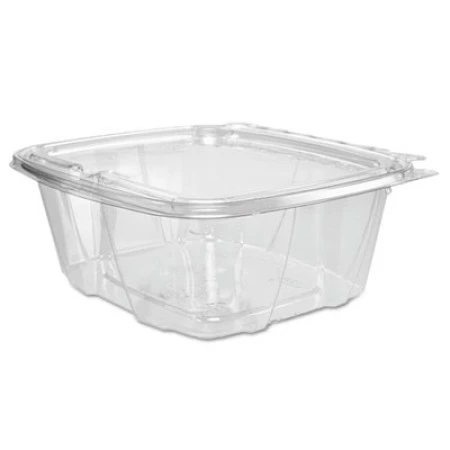 ClearPac Container, 6.4 x 2.6 x 7.1, 32 oz, Clear, 200/Carton. Clear plastic containers provide a positive way to present food, while also providing a clear view of the contents. Secure closure ensures a fresh, safe seal, reducing spillage and mess. Lightweight, stackable and resilient containers are a great choice for quick-service establishments. Easy to take on the go. Tamper-Resistant-Flat lid. Food Container Type: Carryout; Material(s): Plastic; Capacity (Volume): 32 oz; Color(s): Clear.