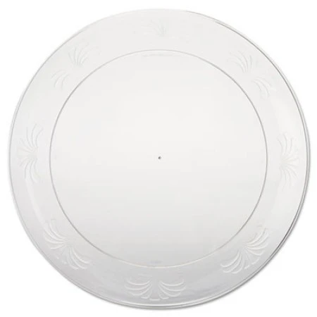 Designerware Plastic Plates, 9 Inches, Clear, Round. Lovely etched plastic dinnerware is made from heavyweight, durable material. Traditional floral etching brings an upscale feel to any event. Designed to complement any food presentation. Provides the beauty of glass with the ease of a disposable. Dinnerware Type: Plate; Material(s): Plastic; Shape: Round; Diameter: 9″.