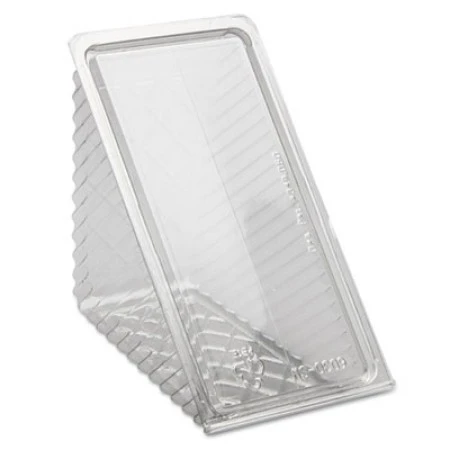 Hinged Lid Sandwich Wedges, Plastic, Clear, 6 1/2 x 3 x 3 1/4, 85/PK, 3 PK/CT. Pick the perfect portion size with sturdy plastic containers that hold a triangular half-sandwich each. Ideal for organizing neat and attractive deli displays. Half-cube packaging is designed for quick-service operations, making it easy for patrons to grab lunch on the go. An economical option for busy cafeterias. Food Container Type: Carryout; Material(s): Plastic; Color(s): Clear; Width: 3 1/4″.