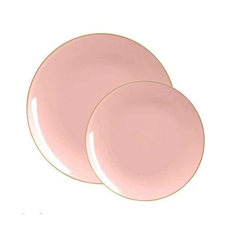 Elevate your table settings with the elegant TigerChef Coral with Gold Rim Plastic Dinner Plate 10-1/4″. Perfect for outdoor receptions, engagement parties, and other special occasions, this tableware boasts a warm coral shade accented with a hint of gold along its rim. Made from premium plastic, it combines the fine look of real china with the affordability and convenience of disposable tableware.