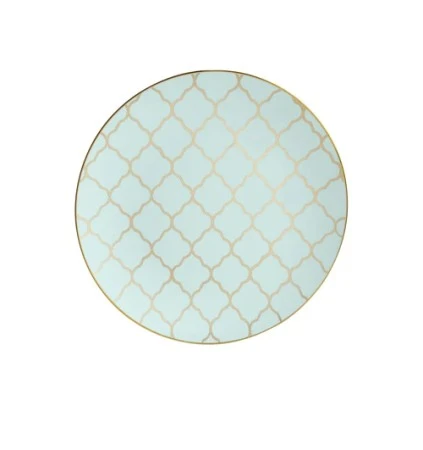 Perfect for bridal showers, engagement parties, and other upscale receptions, the TigerChef Mint Plastic Appetizer Plate with Gold Lattice Pattern 7-1/4″ boasts an elegant look at an affordable price. Featuring a charming mint hue with captivating gold lattice detailing, this high-end disposable plate easily complements any setting.